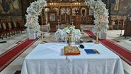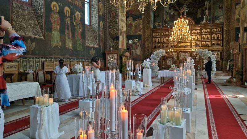 Lele și Andra Volos au ales să își boteze fetița la biserica „Sfânta Treime” din Ghencea. Cadrul a fost unul de poveste, totul fiind împodobit cu flori albe și lumânări. Cum intrai în biserică, puteai observa de o parte și de alta decorul perfect, mese albe, subțiri, elegante, cu lumânări aprinse, iar în fața icoanelor era amenajată o arcadă din flori albe, cristelnița de asemenea decorată în acest fel.