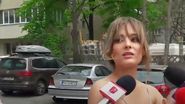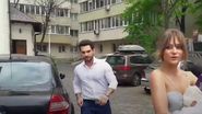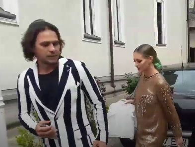 Artista a optat pentru o rochie aurie, larga, iar parul colorat turcoaz si l-a tinut strans. La randul lui, Razvan Munteanu, a purtat un costum in dungi alb negru cu care a iesit din tipare.