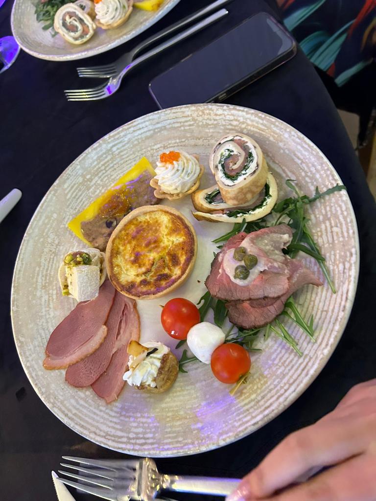 De asemenea, la al doilea fel de mâncare s-a servit file de biban de mare și crevete black tiger cu sos olandez servit cu orez negru, urmând ca la felul principal invitații să deguste pulpă de rață confiată servită cu piure de cartofi cu trufe și, bineînțeles, nu în ultimul rând, desertul, unde va fi servit tortul mirilor.