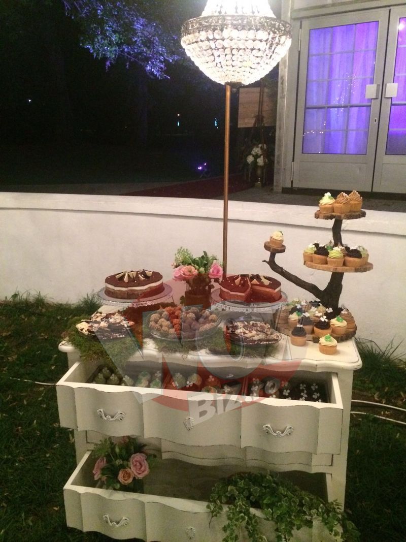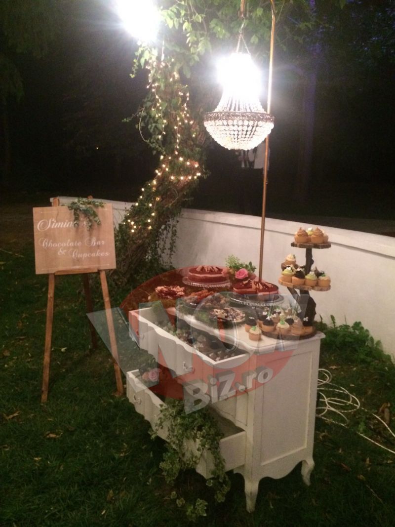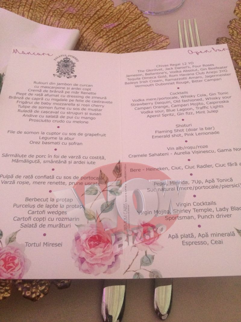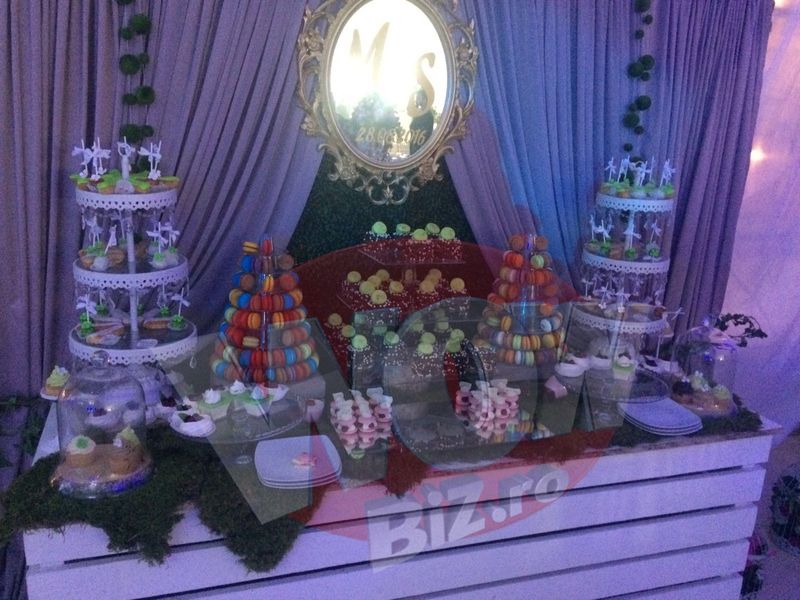 Candy bar-ul a aratat de-a dreptul apetisant. Prajiturile, in principal cupcakes si ciocolata au fost aranjate intr-un suport inedit, luminat de un candelabru cu cristale. Meniul a fost unul de cinci stele din care nu au lipsis purcelusul de lapte sau berbecutul la protap.