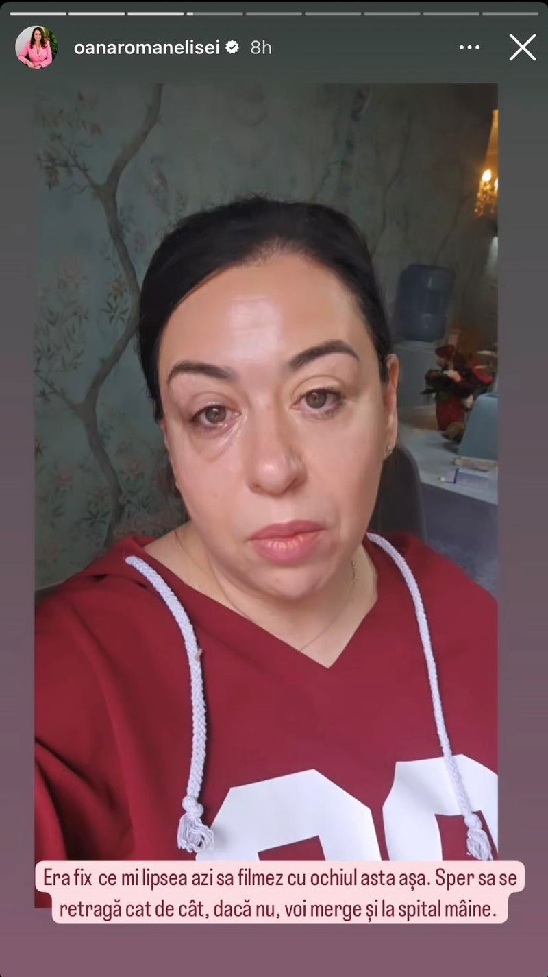 „Azi am o filmare super importantă pentru o campanie și m-am trezit cu ochiul așa. Deocamdată m-am machiat de jur împrejur, am pus tratament și sper ca în 2-3 ore să se retragă cât de cât. Am efectiv un ochi distrus, nu știu cum voi filma astăzi. Asta e viața. Nu avem ce face. Nu știu de la ce s-a făcut așa. Dacă nu se retrage, va trebui să mă duc la spital”, a mărturisit Oana Roman în mediul online.