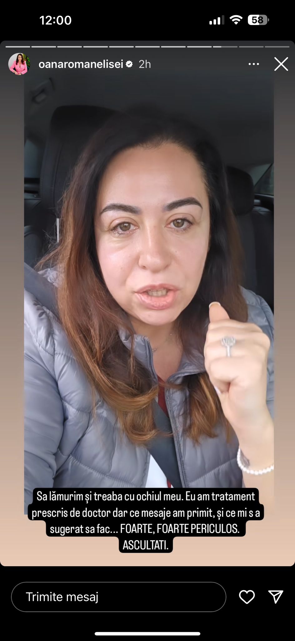 „Să lămurim și treaba cu ochiul meu, pentru că ceva rău. Ieri când m-am trezit cu ochiul umflat am sunat-o pe prietena mea Suzana, care este doctor oftalmolog, și i-am cerut părerea, mi-a prescris un tratament, mi-a dat rețetă, m-am dus la farmacie și m-am tratat. Problema mea este cu sutele de mesaje pe care le-am primit în care primeam sfaturi cu ce trebuie să fac, deși nu cerusem niciun sfat, pentru că știam ce am, dar mai grav este că mi s-au prescris tratamente, mi s-a spus că am conjunctivită, că m-a tras curentul, mi s-a spus că trebuie să îmi pun apă de la vie. Băi fraților, este foarte grav, adică asta este mentalitate de Evul Mediu și este foarte periculoasă pentru că faceți lucrurile ăstea puteți să și muriți, aveți grijă!”, a spus Oana Roman, pe pagina personală de Instagram.