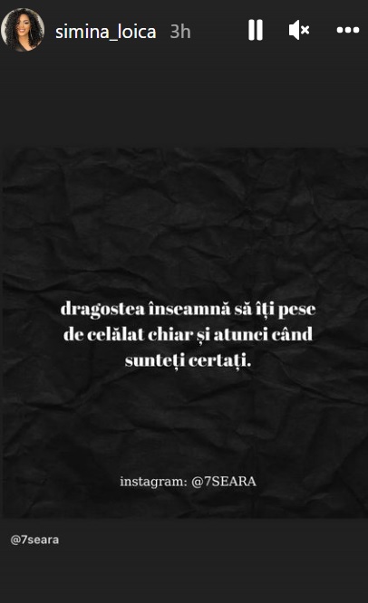 „Dragostea înseamnă să îți pese de celălalt și atunci când sunteți certați”, este mesajul pe care Simina Loica l-a distribuit la InstaStory.