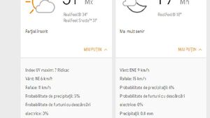 Cerul este predominant însorit, iar temperatura din termometre va fi de 27 de grade C. Vântul va bate cu 9 km/h, iar probabilitatea de precipitații este de 6%. Pe timpul nopții, cerul este senin, iar temperatura de 14 grade C. Se poate observa cum temepraturile în timpul nopții încep ușor să scadă.