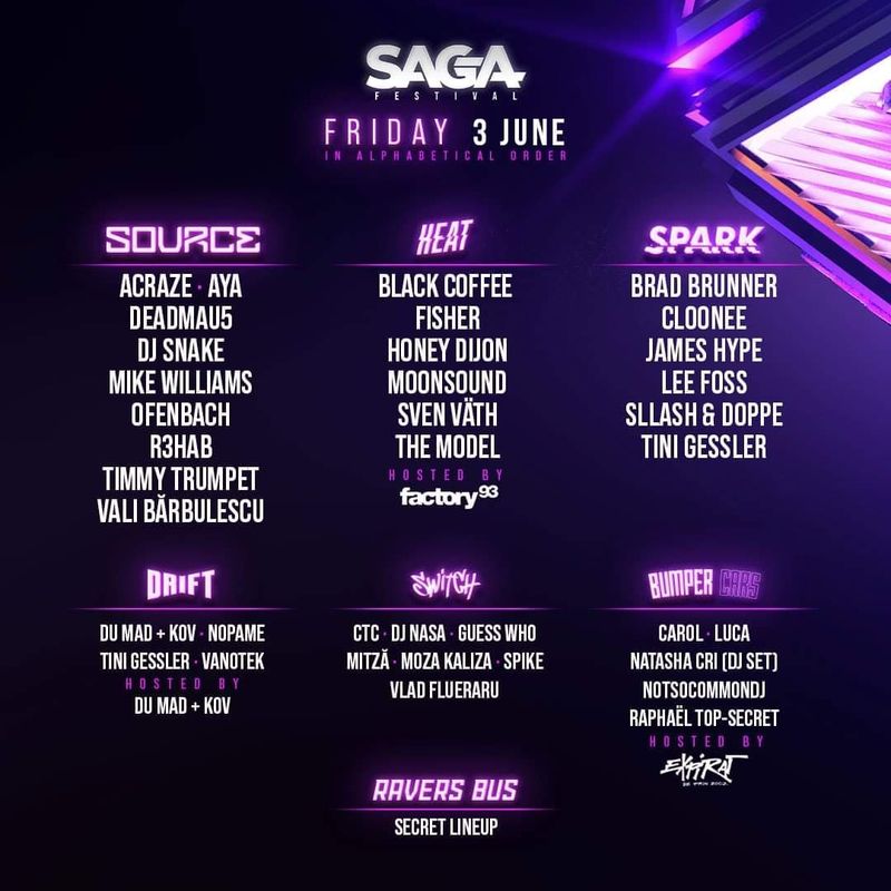 SAGA Festival 2022 va avea loc la Arena Națională din București, în perioada 3-5 iunie. Organizatorii le-au pregătit festivalierilor o mulțime de surprize, dar și cinci scene: The Source, Heat, Spark, Drift, Silent Disco & Secret Stages, unde își vor putea vedea artiștii preferați.