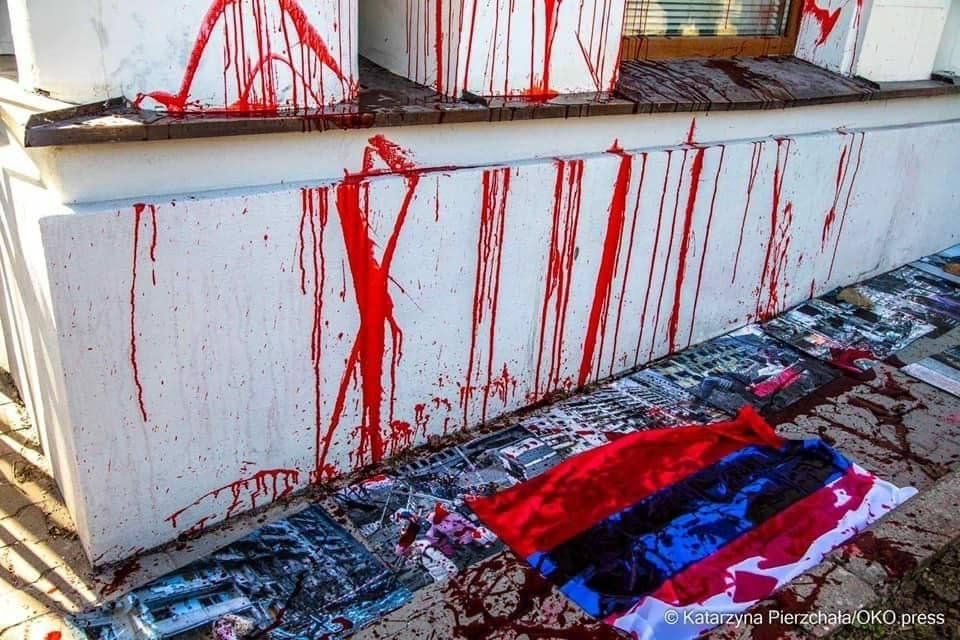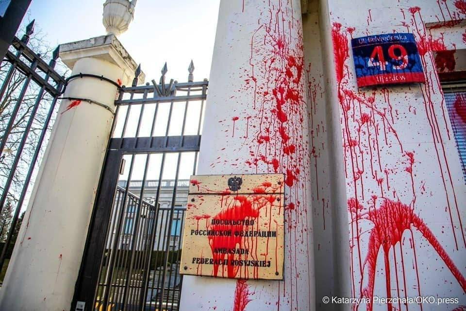 Intrarea Ambasadei Federației Ruse din Polonia acoperită cu sânge fals