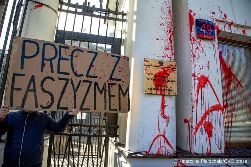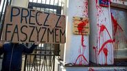 Protest controversat în fața Ambasadei Federației Ruse din Polonia! Oamenii au mânjit cu sânge fals intrarea instituției