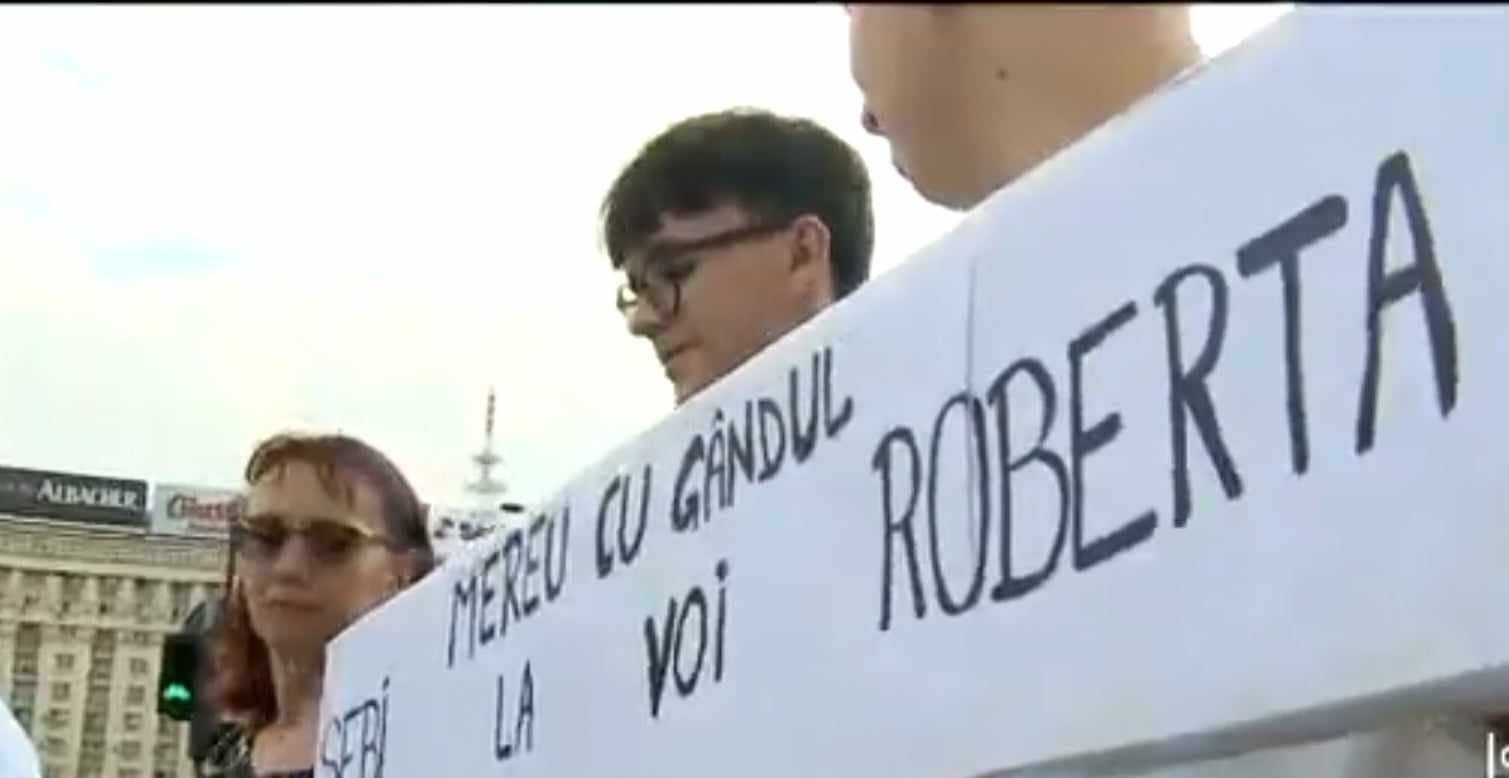 Cele câteva zeci de persoane au ținut în mâini poze cu Roberta și Sebastian și au afișat mesaje precum „Siguranță pentru viitorul tău!” sau „Nu este de ajuns”.