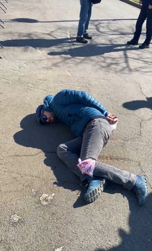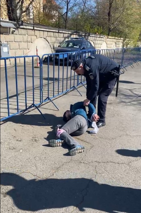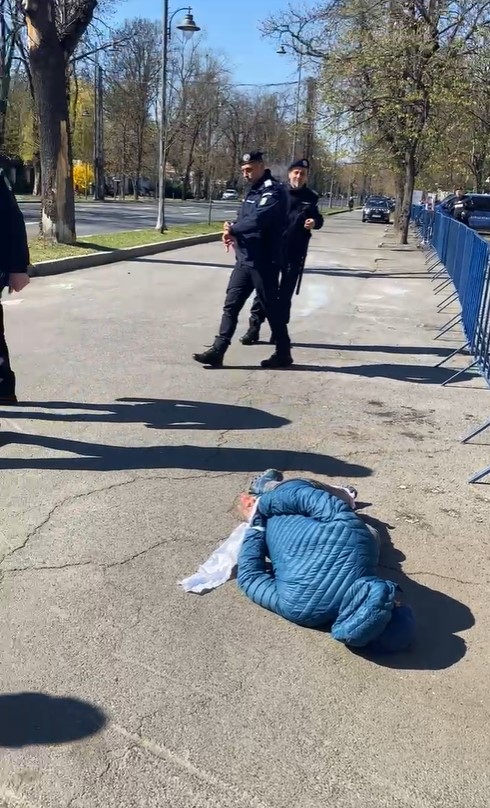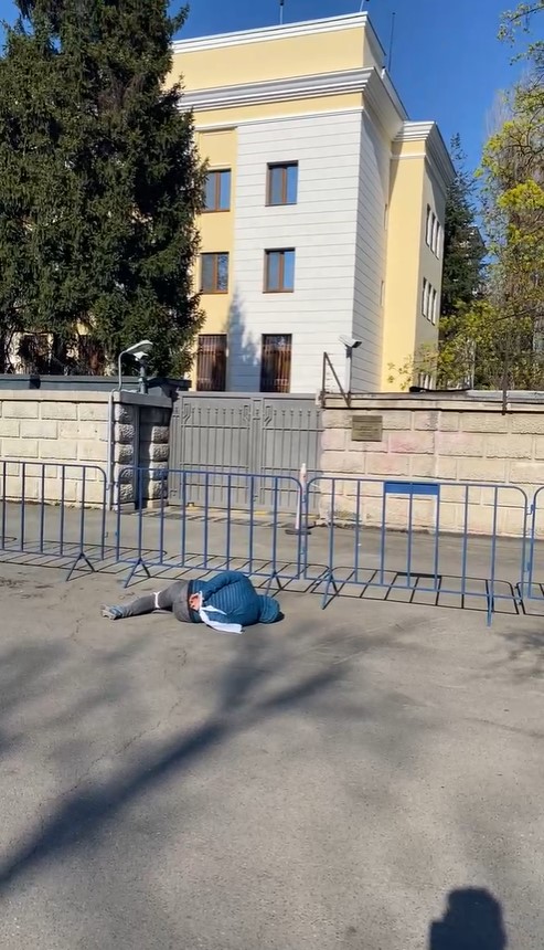 Românul s-a întins în fața instituției și a stat așa preț de o oră. Gestul lui este în semn de revoltă față de crimele comise în Bucha de armata Rusiei.