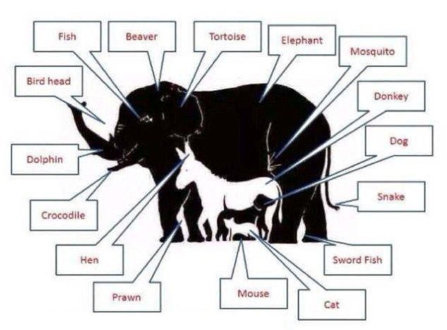 Evident, răspunsurile lor au variant, însă în fotografie se ascund nu mai puţin de 16 animale. Elefantul este, fără doar şi poate, cel mai uşor de reperat, însă delfinul şi pantera sunt aproape imposibil de găsit.