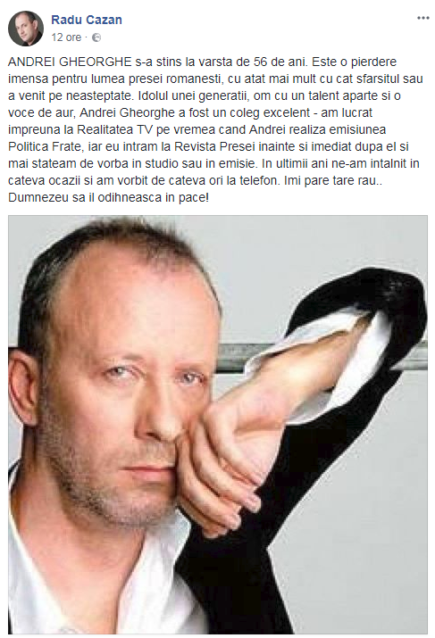Andrei Gheorghe s-a stins din viata la doar 56 de ani. Jurnalistul a fost gasit prabusit in baie, acasa, iar primele ipoteza indica faptul ca ar fi murit din cauza unui stop cardio-respirator. Radu Cazan a fost socat de veste si a scris cateva randuri, pe pagina sa de socializare, despre Andrei Gheorghe.