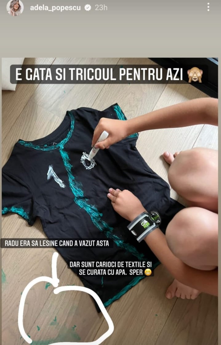 O fotografie postată de Adela Popescu pe Instagram, cu unul dintre fiii săi, a stârnit amuzamentul celor de acasă. Micuțul, care este de-a dreptul pasionat de desen, a decis să-și încerce talentul pe unul dintre tricourile pe care le purta, așa că a luat mai multe carioci și s-a apucat de treabă. Dacă actrița a reacționat destul de calm la vederea „capodoperei”, nu același lucru s-a întâmplat și în cazul lui Radu Vâlcan: „E gata și tricoul pentru azi. Radu era să leșine când a văzut asta. Dar sunt carioci textile și se curăță cu apă, sper!”, a scris Adela Popescu pe rețelele de socializare, în dreptul fotografiei cu fiul ei.