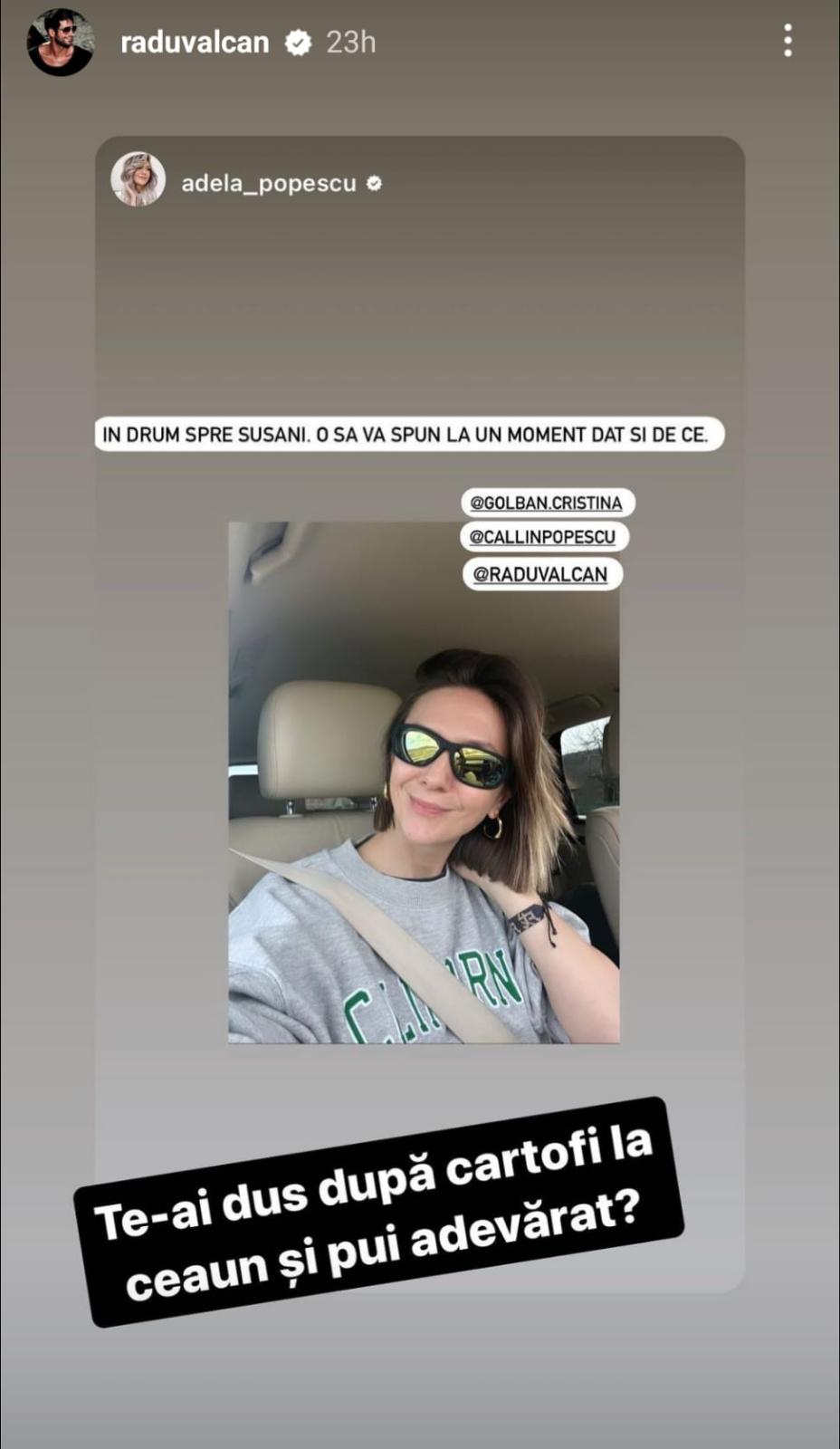 La scurt timp după ce soția lui a făcut publică postarea, Radu Vâlcan a reacționat și el. Bărbatul a repostat InstaStory-ul partenerei sale și a făcut o glumiță în legătură cu plecarea soției lui. Vedeta TV a întrebat-o pe Adela dacă a mers la cei care i-au dat viață pentru a lua cartofi la ceaun și pui adevărat.