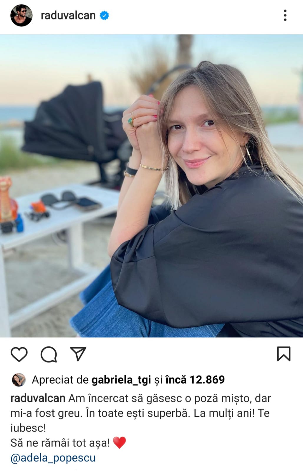 La ceas aniversar, Radu Vâlcan nu s-a putut abține să nu îi transmită soției lui un mesaj emoționant, așa cum o face de fiecare dată, astfel că i-a scris câteva rânduri partenerei sale, alături de o poză pe care i-a făcut-o acum ceva timp: „Am încercat să găsesc o poză mișto, dar mi-a fost greu. În toate ești superbă. La mulți ani! Te iubesc! Să ne rămâi tot așa.”, a fost mesajul postat de Radu Vâlcan pe contul lui personal, cu ocazia zilei de naștere a Adelei Popescu.