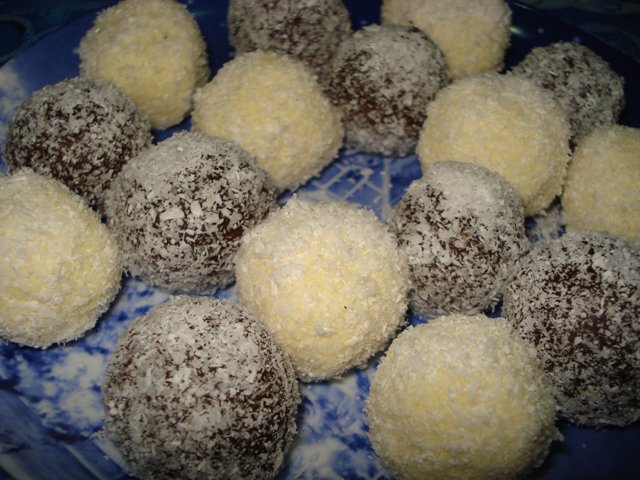Mod de preparare: Se amesteca toate ingredientele in robotul de bucatarie, se fac bilute si se dau prin fulgi de nuca de cocos. Ca sa diversifici si sa ai mai multe culori, le poti rostogoli prin fistic crud macinat, cacao pudra sau ciocolata neagra maruntita.