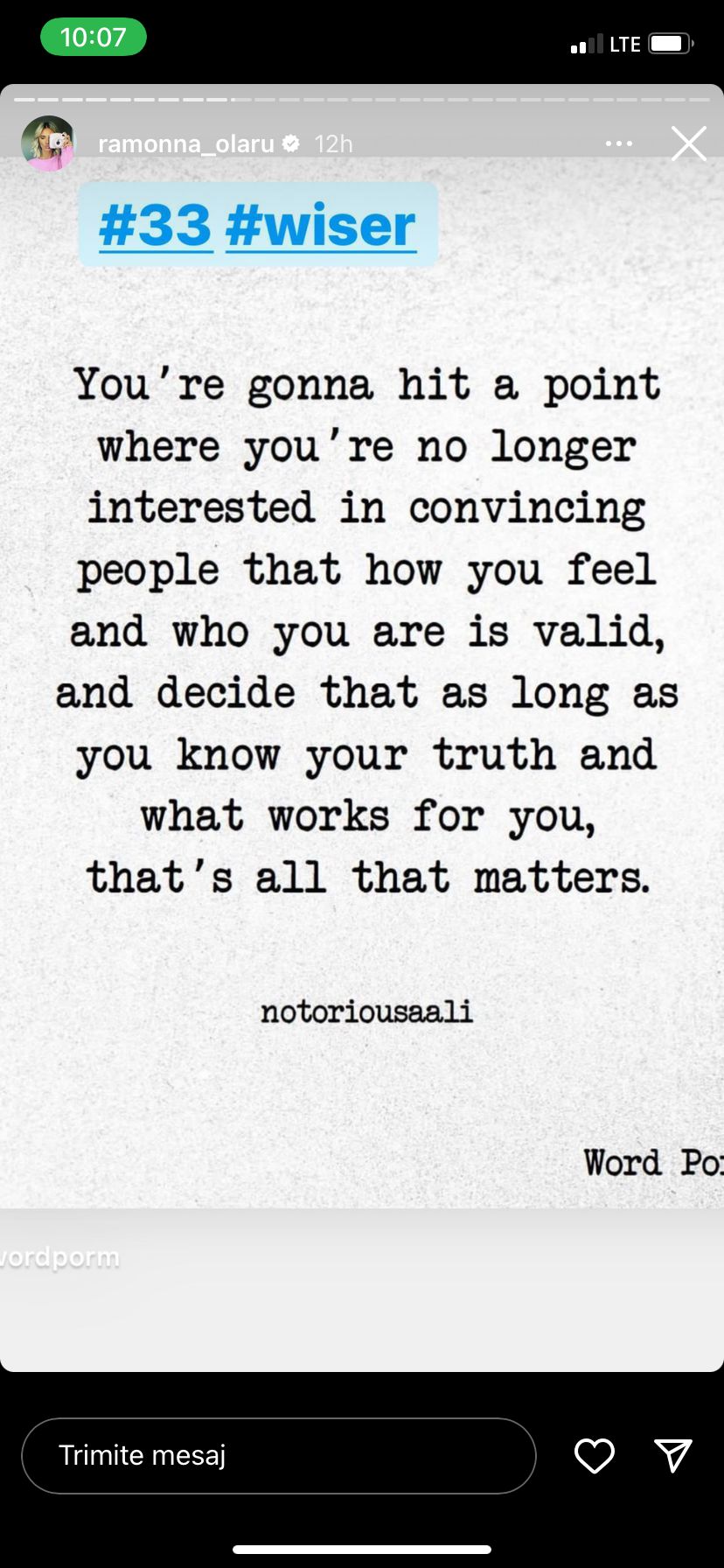 „Vei ajunge într-un punct în care nu vei mai fi interesat să convingi oamenii că felul în care te simți și cine ești este valid și vei decide că atâta timp cât îți cunoști adevărul și ceea ce funcționează pentru tine, asta este tot ceea ce contează.”, a scris Ramona Olaru pe Instagarm, cu ocazia zilei sale de naștere.