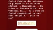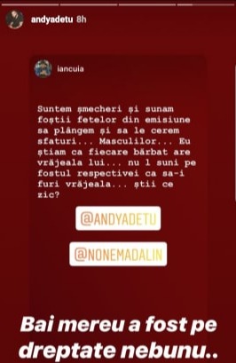 Recent, Adrian, fostul concurent de la Puterea dragostei, scria pe Instagram și îi ataca pe tinerii care se află acum în casă. Oare la cine se referea?! Andy a intervenit și el, a dat share postării și a făcut scurte comentarii.