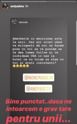 "Șmecherie în emisiunea asta la unii. Dar ați uitat când vă milogeați de noi să facem poze cu voi, să vă postăm ca să vă dea lumea follow și vă închideam ușa în nas la hotel pentru că nu voiam să stăm cu voi și erați insistenți?", a mai scris Adrian și le-a dat tag lui Andy și None.