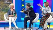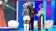 Ceilalti invitati din platou s-au amuzat copios atat de afirmatiile barbatului transformat in femeie cat si de tinuta lui.