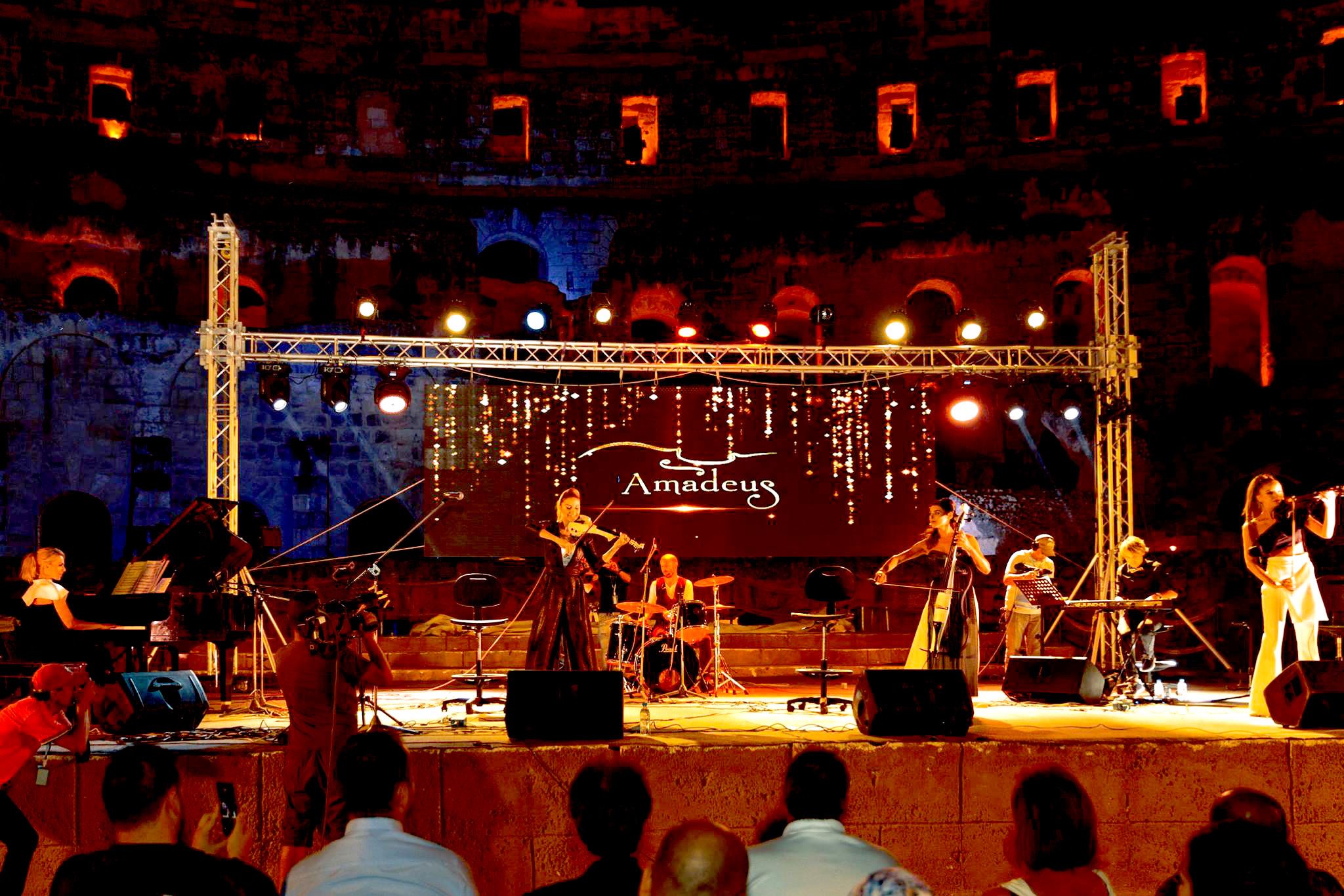 Artistele din trupa Amadeus au susţinut un concert pe o scenă amplasată în mijlocul amfiteatrului, înconjurate de lumini şi făclii, şi urmărite de mii de persoane din lojele şi de pe treptele anticei construcţii.
