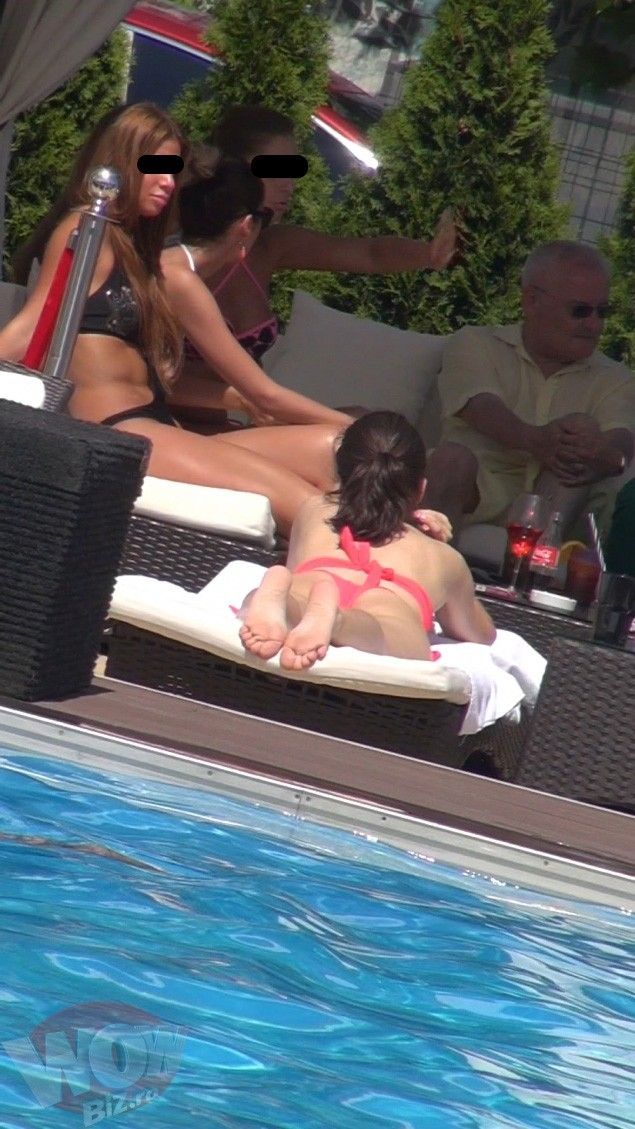 Si nu le-a tinut pe uscat, Columbeanu le-a comandat la fete o sticla de vin rose fin si le-a inchiriat cate un sezlong ca se bronzeze. Cu ochelarii de soare la ochi, dar cu tricoul pe el, Iri a preferat sa stea mai mult la umbra si sa le priveasca cu pofta pe fetele de masa sa.
