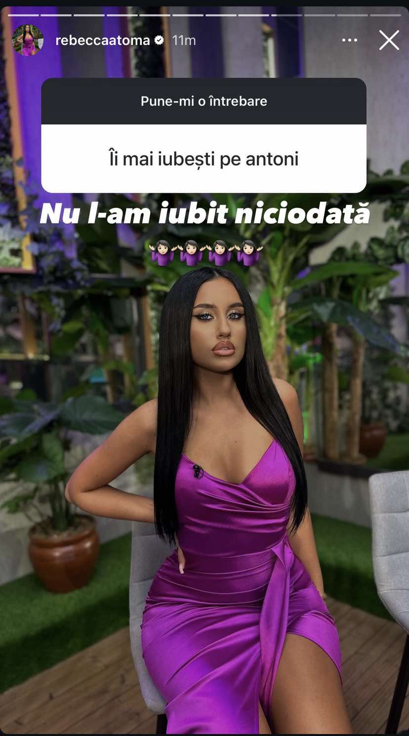 Pe pagina sa de Instagram, Rebecca a fost întrebată de un fan dacă îl mai iubește pe concurent. Extrem de sinceră și directă, Rebecca a oferit un răspuns la care nimeni nu se aștepta, spunând că nu l-a iubit, de fapt, niciodată pe Antoni.