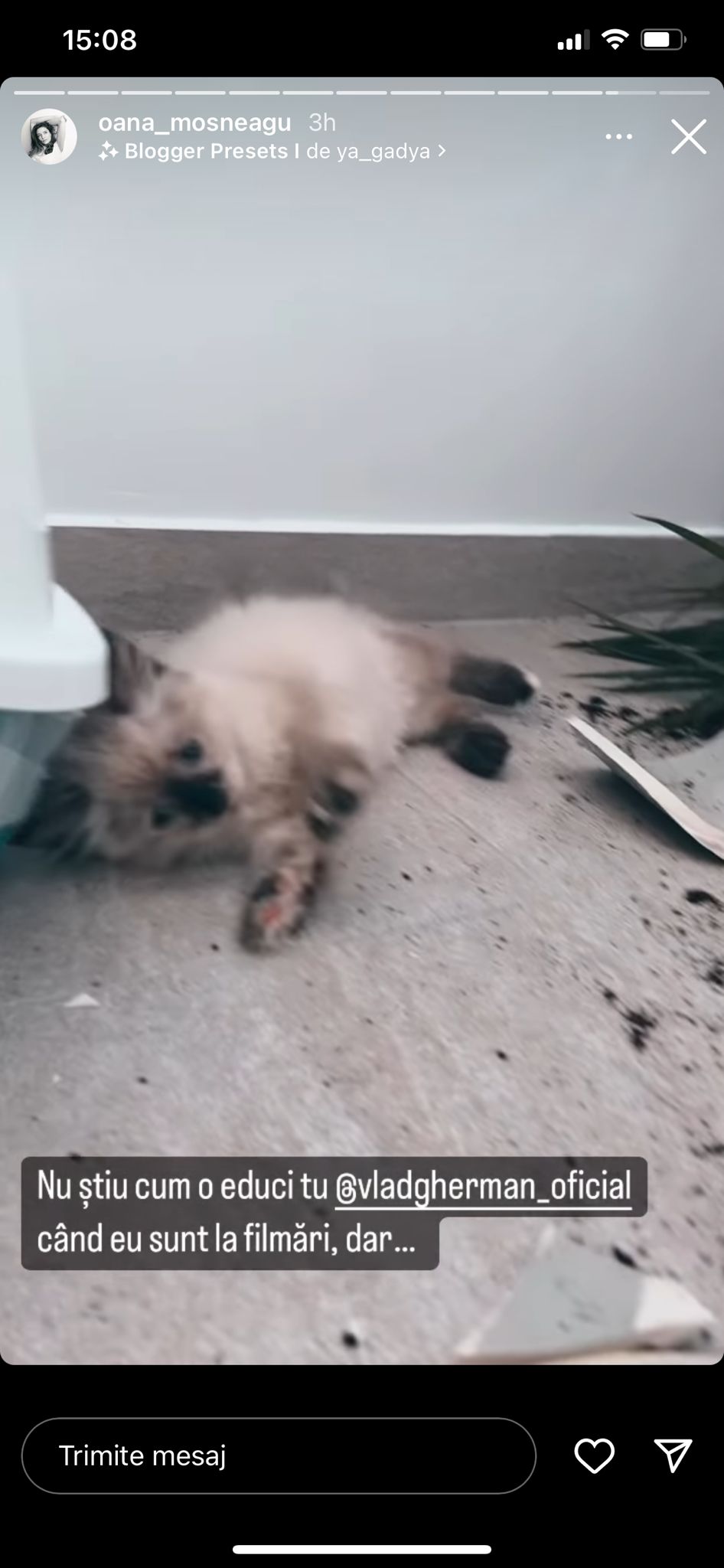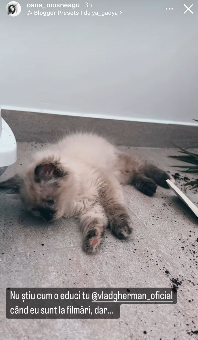 În urmă cu puțin timp, Oana Moșneagu s-a întors de la filmări, iar ce a găsit în casă aproape că a lăsat-o fără cuvinte. Se pare că felina a decis să exploreze puțin noua casă și a dărâmat un ghiveci cu flori, iar mizeria este de nedescris. Astfel că actrița i-a bătut puțin obrazul iubitului ei: „Nu știu cu o educi tu Vlad Gherman când eu sunt la filmări, dar…”