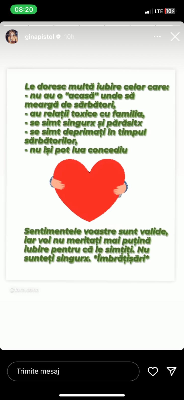 Sentimentele voastre sunt valide, iar voi nu meritați mai puțină iubire pentru că le simțiți. Nu sunteți singuri. Îmbrățișări.”, a fost mesajul pe care Gina Pistol l-a postat în mediul online, în prima zi de Crăciun.