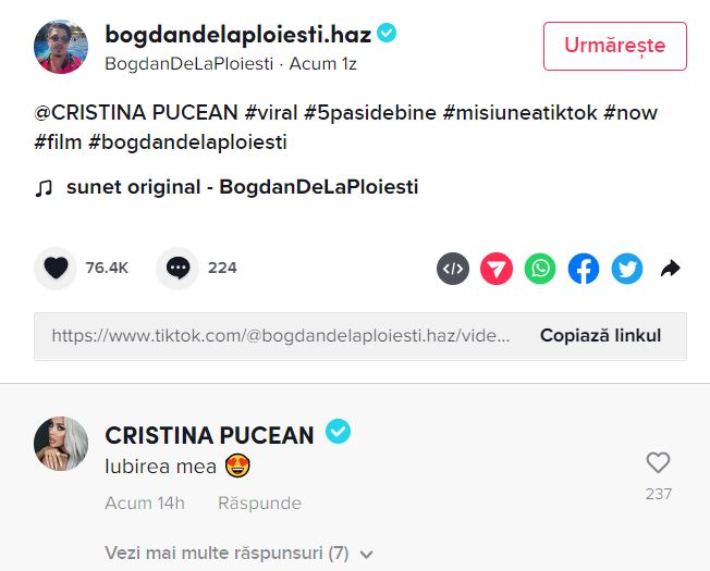 Bogdan de la Ploiești și Cristina Pucean încă se află într-o vacanță de lux în Dubai. Iubirea plutește în aer se pare, iar cei doi încep să recunoască, fără să lase loc de interpretări, faptul că formează un cuplu și că sunt foarte îndrăgostiți unul de altul. Cu numai câteva ore în urmă, dansatoarea maneliștilor a făcut o declarație surprinzătoare în mediul online, care certifică faptul că este îndrăgostită până peste cap de Bogdan de la Ploiești.