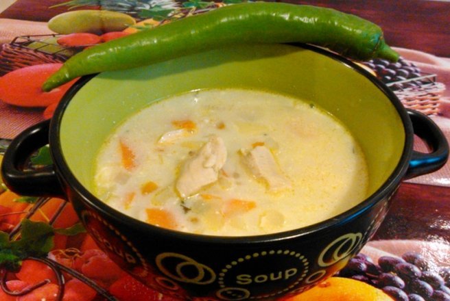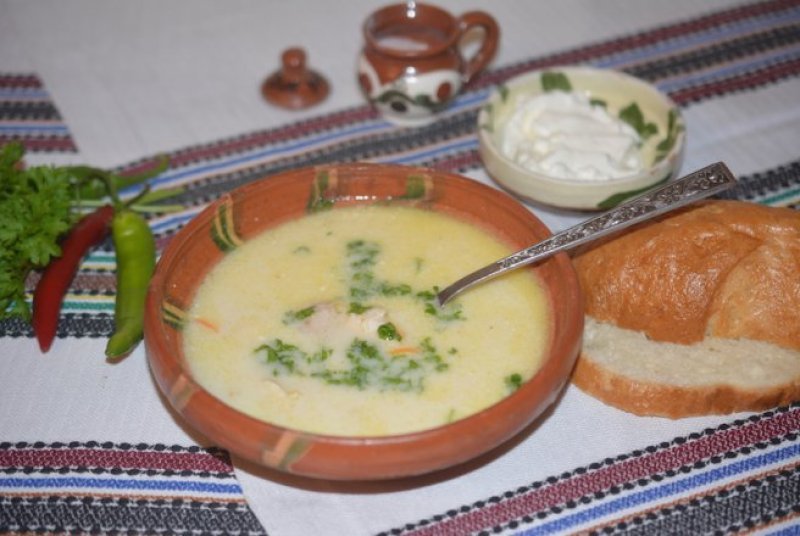 Ingrediente: 1 pui (cca 1 kg); 1 ceapa; 2 morcovi; 1 radacina de patrunjel; 1 telina; 2 oua; 150 ml lapte gras;1 lamaie mare; 4 linguri orez fiert; 100 g smantana; 2 l apa; 1 lingura leustean verde tocat; 1 lingura patrunjel verde tocat; sare; piper boabe.