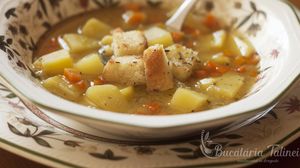 Ceapa se toaca marunt si se caleste in ulei de masline pana cand devine translucida. Se adauga apoi in supa impreuna cu morcovii tocati cubulete. Se pune capacul si se lasa la gatit pana cand toate legumele se inmoaie.