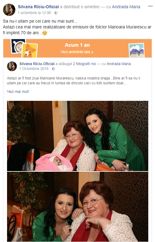 Unul dintre interpretii de muzica populara care nu a dat-o uitarii este Silvana Riciu. Artista a postat chiar si zilele trecute doua imagini, pe contul ei de socializare, si un mesaj in memoria Marioarei Murarescu, una din figurile cele mai marcante al folclorului romanesc, care i-a botezat si fetita, pe Andrada.