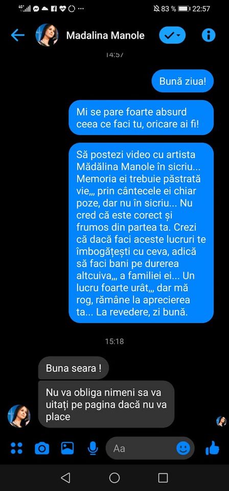 O reacție dură a venit și din partea userului Alainada Jones, administrator al unei alte pagini deducate memoriei Mădălinei Manole, care a anunțat că va acționa în instanță pe cel care a postat imaginile cu artista în sicriu.