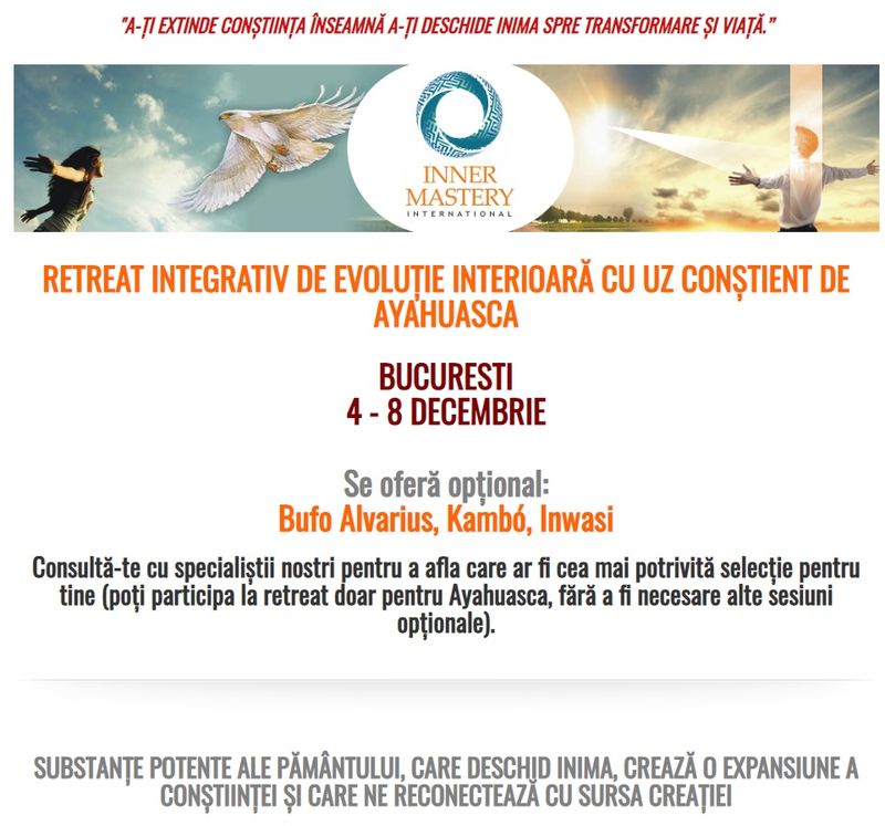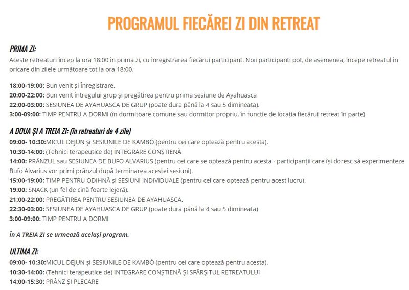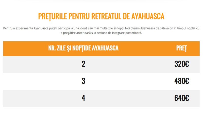 „Retreaturile pe care le găzduim se bazează pe Ayahuasca, puteți alege între una, două sau mai multe zile și nopți și apoi în timpul retreatului puteți alege să participați la sesiunile opționale de Bufo Alvarius sau Kambó, care au costuri suplimentare. Compania noastră a efectuat peste 300 de retreaturi pe an în ultimii 5 ani în peste 20 de țări, în care au participat, cu mare satisfacție, mai mult de 50.000 de persoane. Facilitatorii noștri au urmat o pregătire în ciclul nostru de formare, European School of Ayahuasca (Școala Europeană de Ayahuasca), și de asemenea la Conscious School (Școala Conștientă), special concepute pentru o pregătire unică și exclusivă, la care participă mai mult de 500 de studenți pe an, ca parte a metodei INNER EVOLUTION (de evoluție internă), a cărei propunere inițială reunește instrumente, tehnici și abordări multiple pentru a amplifica experiența cu substanțele naturale enteogene”, se laudă traficanţii de droguri.