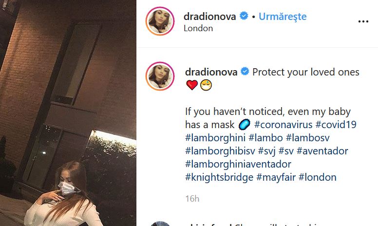 ”Protejați-i pe cei dragi! În caz că nu ați observat, și iubitul meu are o mască”, a scris Daria pe contul ei de socialziare, făcând referire la Lamborghini-ul cu mulți cai putere pe care-l iubește ca pe ochii din cap. Postarea a stârnit multe reacții, marea majoritate sfătuind-o totuși să intre mai repede în casă pentru că e periculossă stea prea mult afară în astfel de vremuri.