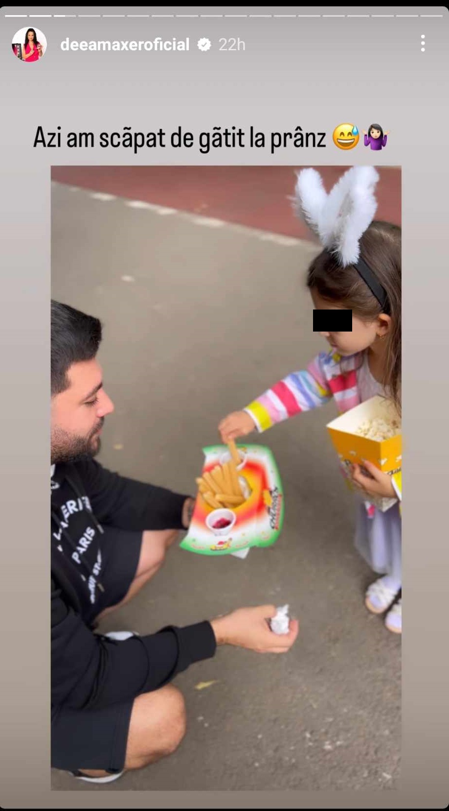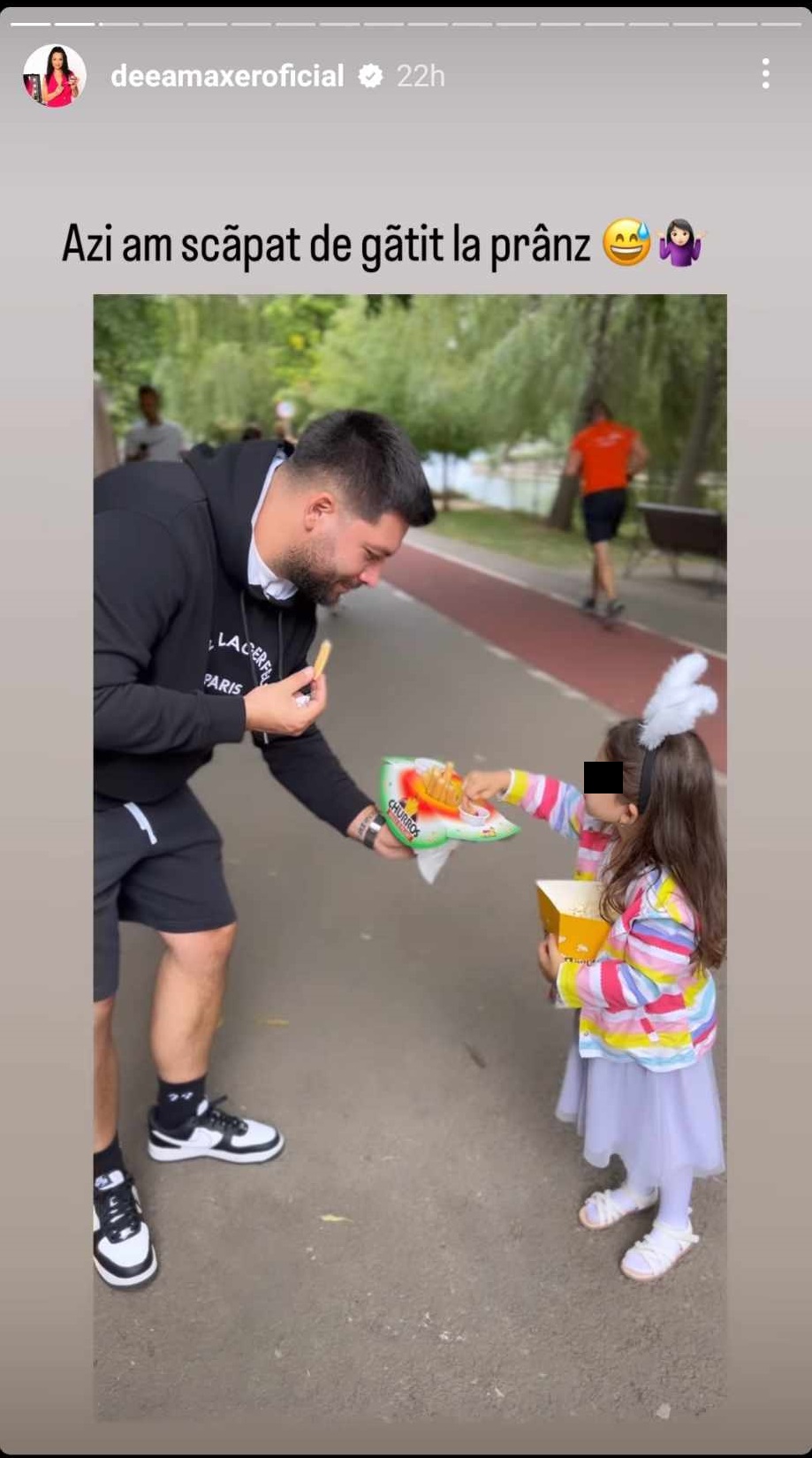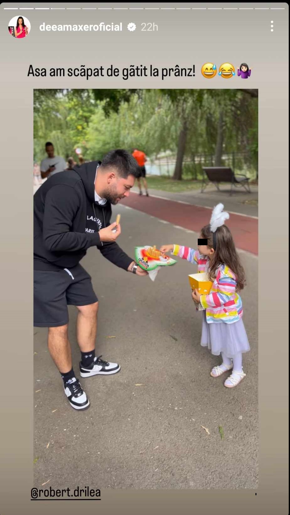 În filmulețul de pe Instagram, Robert Drilea și fiica vedetei se află în parc și savurează un preparat de streed food împreună. Alături de videoclip, Deea Maxer a scris: „Azi am scăpat de gătit la prânz”, semn că mâncarea a fost pe gustul fetiței sale, dar și al lor.