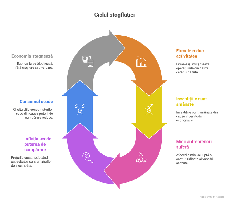 Prețurile la alimente, chirii și utilități continuă să urce, în timp ce salariile reale scad.„Este un cerc vicios periculos. Pe măsură ce companiile concediază, consumul scade. Iar când scade consumul, firmele vând și mai puțin. În final, toată economia se blochează. Este imaginea clasică a stagflației: prețurile cresc, dar economia nu mai produce valoare”, explică surse economice apropiate de piață.