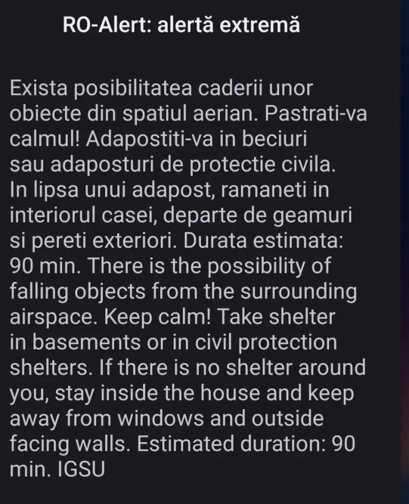 „Există posibilitatea căderii unor obiecte din spațiul aerian. Păstrați vă calmul, adăpostiți vă în beciuri sau adăposturi de protecție civilă. În lipsa unui adăpost, rămâneți în interiorul casei, departe de geamuri sau pereții exteriori”, scria în mesajul RO-Alert trimis de autoritățile din Tulce și Galați.