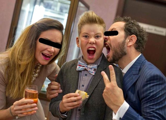 Albert si Romanita Iovan au fost imbracati foarte elegant, designerul intr-o tinuta care ii punea frumusetea in valoare, iar pustiul ei intr-un costum de cavaler compus din pantalon, haina, camasa asortata cu papion si, in plus, un baston sic care ii dadea o nota eleganta.