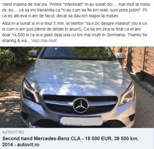 “Vând maşina de mai jos. Printre „interesaţi” m-au sunat doi … mai mult la mişto zic eu … ca să îmi transmită că „n-au cum să fie km reali, sunt prea puţini”. Pt. că eu altceva n-am de făcut, decât să dau km înapoi la maşini. Altul m-a sunat şi m-a ţinut 5 min. la telefon „să îi zic despre maşină” (nu e ca şi cum n-am pus jdemii de detalii în anunţ). Ca să îmi zică la final că el are doar 14.000 şi că si-a gasit deja una cu km mai mulţi în Germania. Thanks for sharing & wasting my time, bro! Aşadar, jur pe roşu că-s kilometri reali, dac-o vreţi”, a postat Biriş.