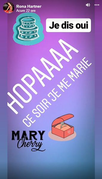 ” Azi (n.r.: ieri) e ziua nunții mele. HOPAAAA. Aujourd’hui je me marie hopaaaa”, a scris Rona Hartner pe pagina sa oficială de Facebook.