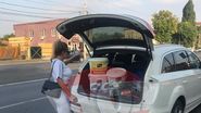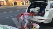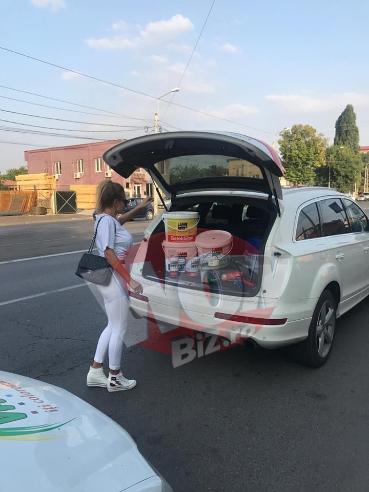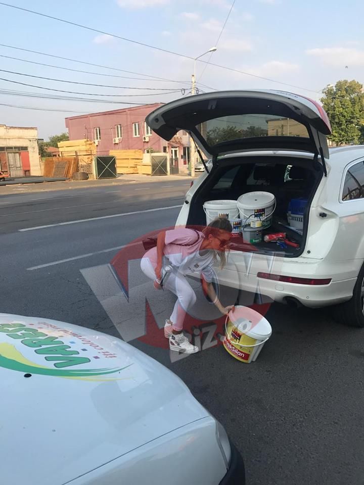 Imbracata sexy, cu o pereche de pantaloni albi, mulati pe posterior, asortati cu un tricou scurt, cu buricul la vedere, si parul strans in coada, vedeta s-a apucat sa care galetile imense cu vopsea la masina.