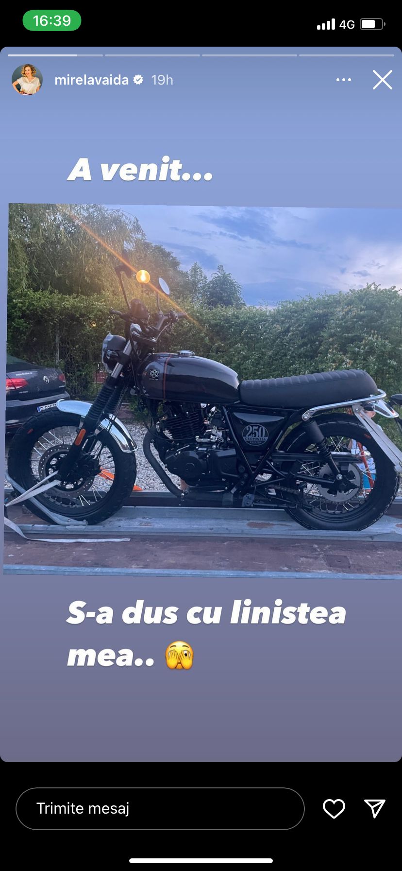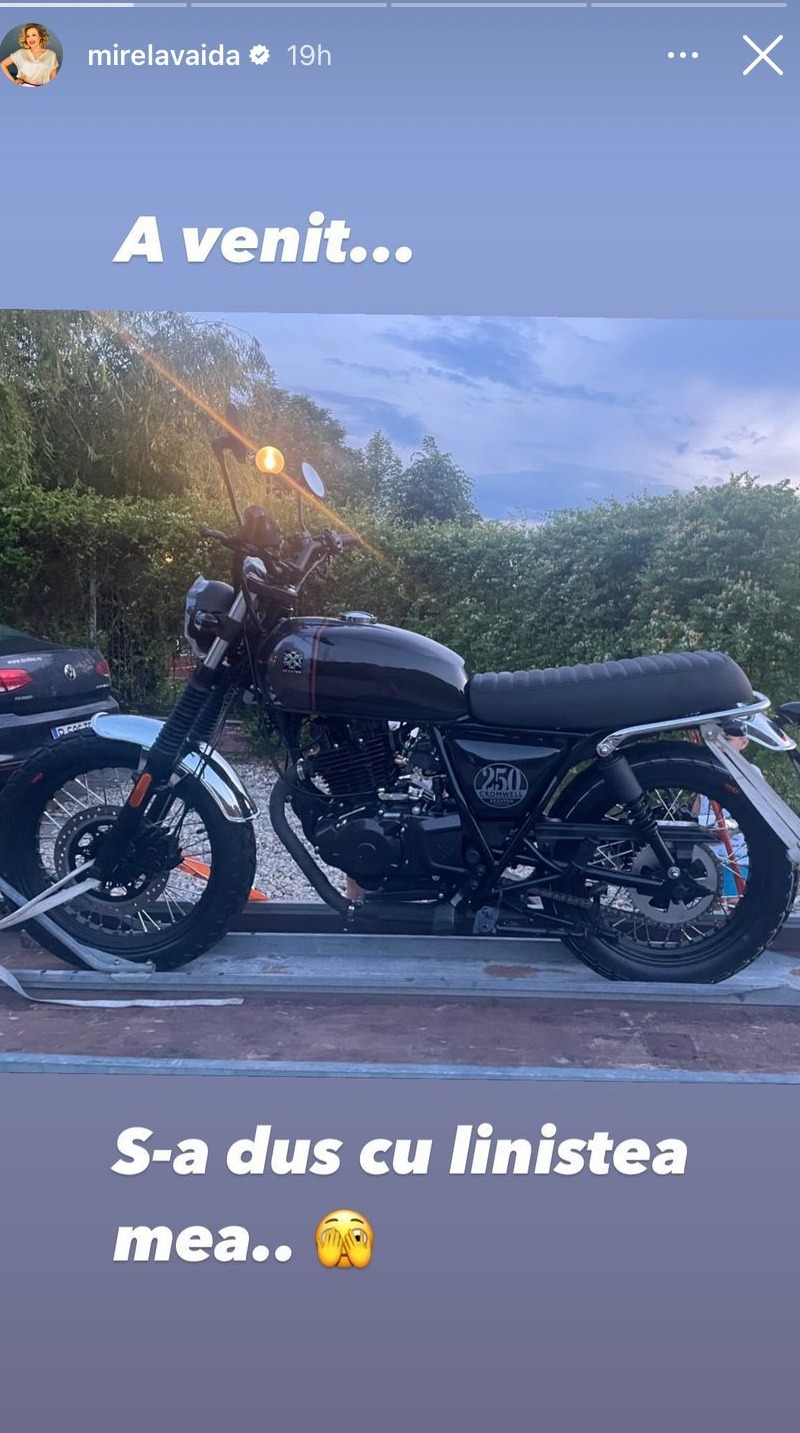 „A venit… S-a dus cu liniștea mea… A venit motocicleta…”, a scris Mirela Vaida în mediul online.