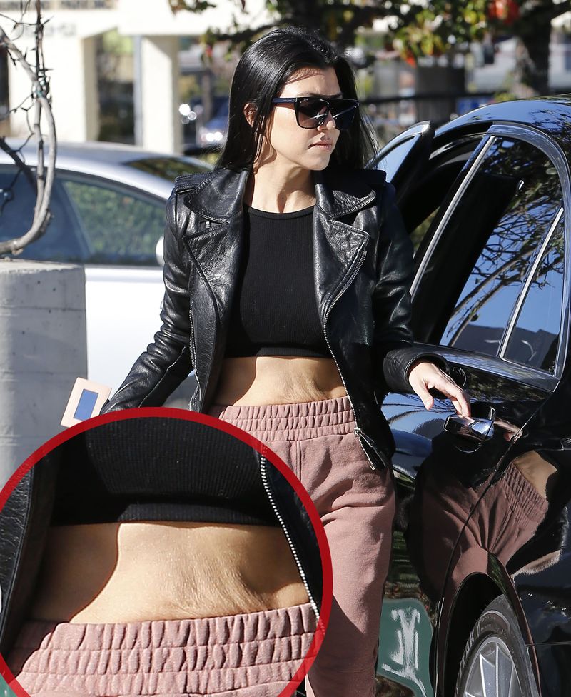 Kourtney Kardashian a fost surprinsa de paparazzi in timp ce-si ducea fetita la cursul de balet. Vedeta de reality show a fost total neinspirata cand si-a ales tinuta. Imbracata cu un top negru, scurt si cu pantaloni sport, largi, Kourtney a lasat la vedere abdomenul distrus dupa sarcinile pe care le-a avut. Pielea flasca a oferit privirii o imagine deloc placuta.