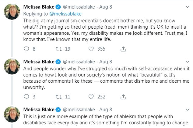 "M-am săturat de oameni, de bărbați în special, care au impresia că este OK să insulți o femeie, să râzi de fizicul ei. Da, dizabilitatea cu care m-am născut mă face să arăt diferit. Știu asta. Am știut asta toată viața mea. Iar apoi oamenii se miră de ce m-am luptat atât de tare să mă accept și să mă iubesc. M-am chinuit tocmai din cauza acestui gen de comentarii, prin care oamenii încearcă să mă umilească.", a mai spus ea.