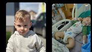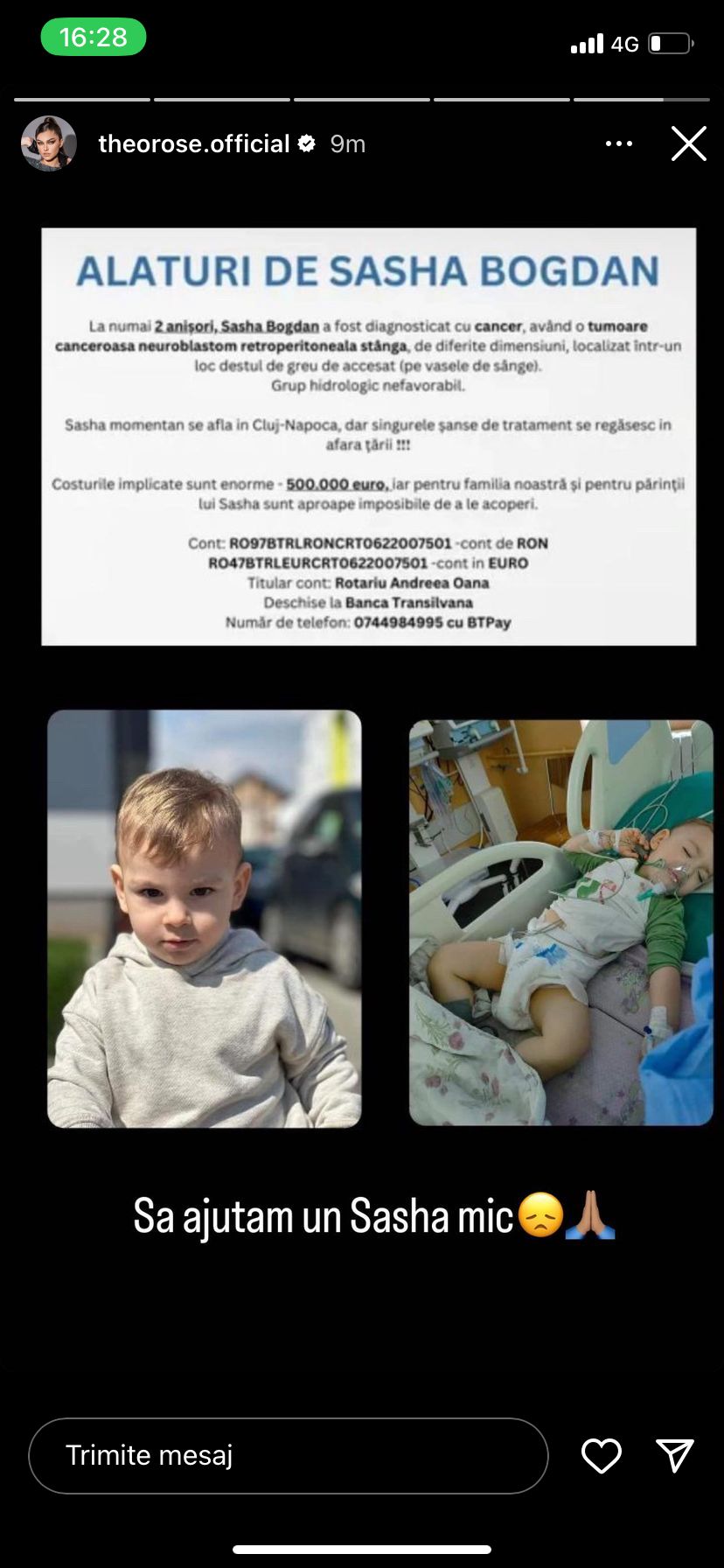 Numár de telefon: 0744984995 cu BTPay”, este scris în dreptul imaginii cu micuțul suferind pe patul de spital.