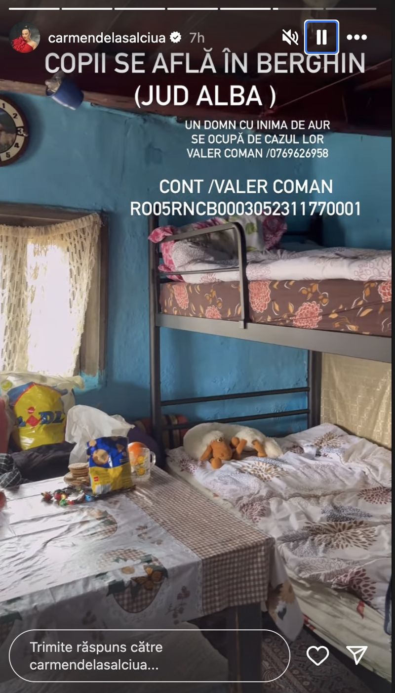 „Nu obișnuiesc să fac asta. Eu cred că binele făcut ar trebui făcut în liniște și nu ar trebui să știe stânga ce face dreapta, însă apelez din nou la bunăvoința și bunătatea voastră. Mă aflu în Berghin, în această casă. După cum vedeți, o cameră destul de mică în care locuiesc 5 copii și o mămică. Tatăl lor a murit de curând. Tatăl lor e un înger și îi păzește de sus, dar eu vă rog pe voi, cei care aveți bunătate în suflet, să ajutați cu ce puteți. Aici voi lăsa un număr de cont. Am ajutat și eu cât am putut și împreună să le construim o mică căsuță, să se bucure și ei.”, a spus Carmen de la Sălciua în mediul online.