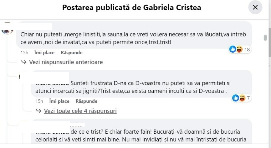 „Chiar nu puteați merge liniștiți la saună, la ce vreți voi? Era necesar să vă lăudați? Vă întreb, ce avem noi de învățat? Că vă puteți permite ore? Trist, trist!”, a fost comentariul lăsat de una dintre urmăritoarele Gabrielei Cristea.