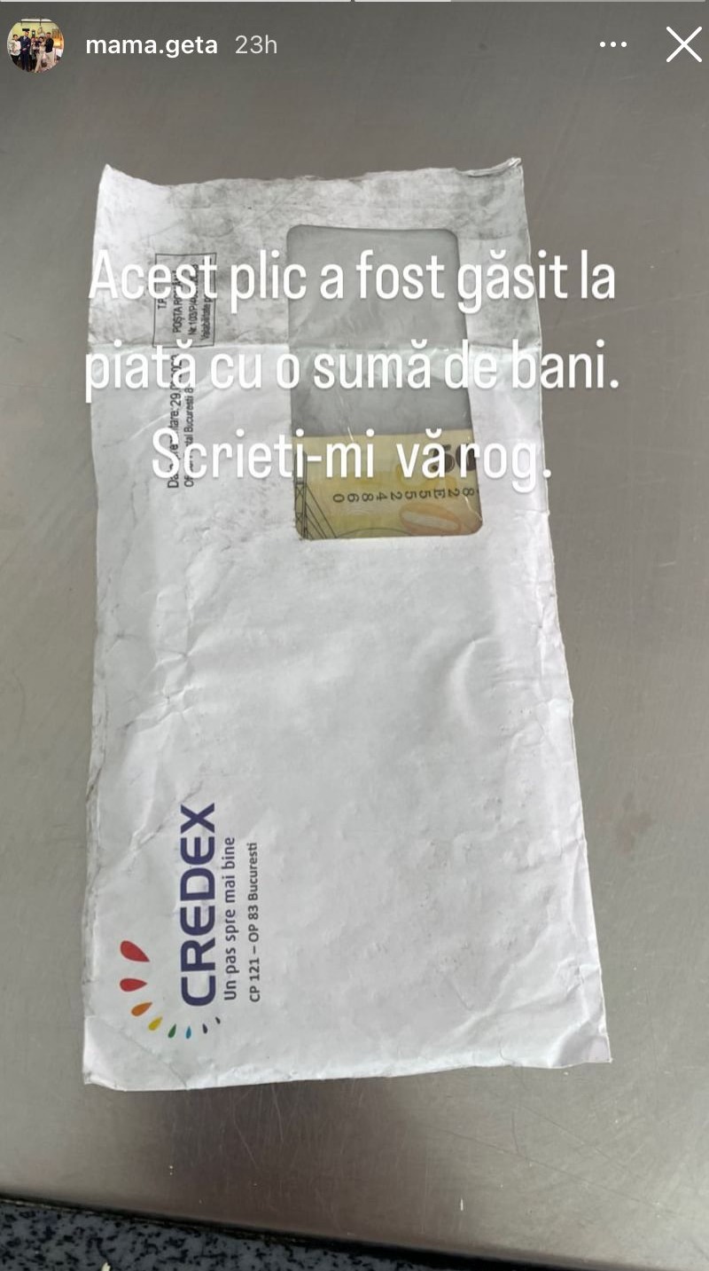 „Bună ziua! S-a găsit un plic cu bani aici între ușa la piață și magazinul chinezesc. Cine crede că i-a pierdut să-mi scrie să vină după ei.”, a spus mama Geta în mediul online.