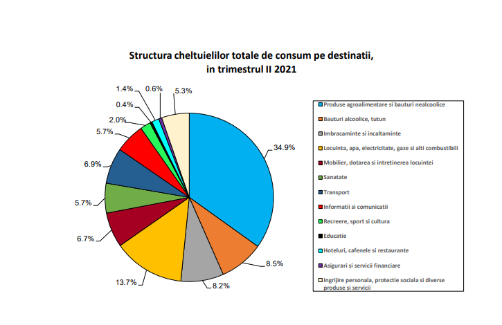 Conform graficului realizat de INS, putem observa Structura Cheltuielilor totale de consum pe destinații în trimestrul al doilea al anului 2021. Mai exact, un procent de 34.9% din veniturile românilor s-au dus pe produse agroalimentare și băuturi nealcoolice, 13.7% sunt costuri pentru locuință, apă, electricitate, gaze, 8.5% din bani se duc pe băuturi alcoolice și tutun, un procent de 8.2% pe îmbrăcăminte și încălțăminte. La polul opus, doar 2% dintre veniturile românilor sunt cheltuite pe activități de recreere, sport și cultură și doar 0,4% pentru educație.
